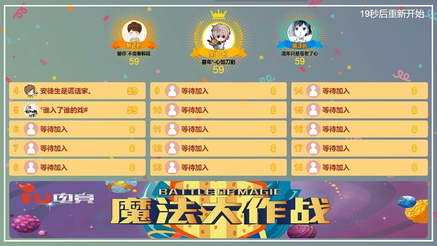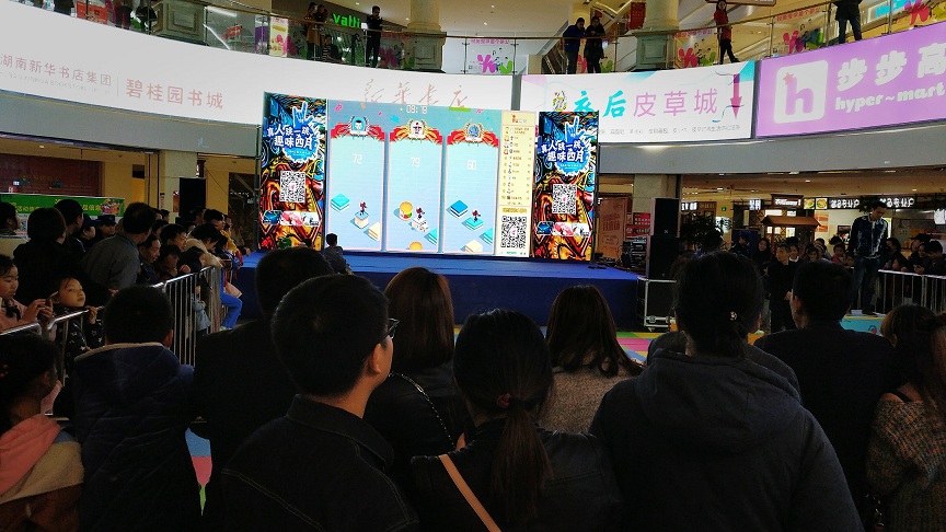 答:不同的产品套餐可参与人数是不一样的,免费版限制5人参与,商业版限制500人参与,商场版不设人数限制。另外,我们的大屏互动游戏分为2种模式:同屏模式和直播模式;同屏模式下一个大屏幕最多允许10位玩家在线PK,其他玩家进入排队,前10位玩家有人死掉后,排队的玩家立即顶替死亡的玩家;直播模式下玩家各自在自己手机上玩游戏,大屏幕上直播前几名玩家的手机画面。