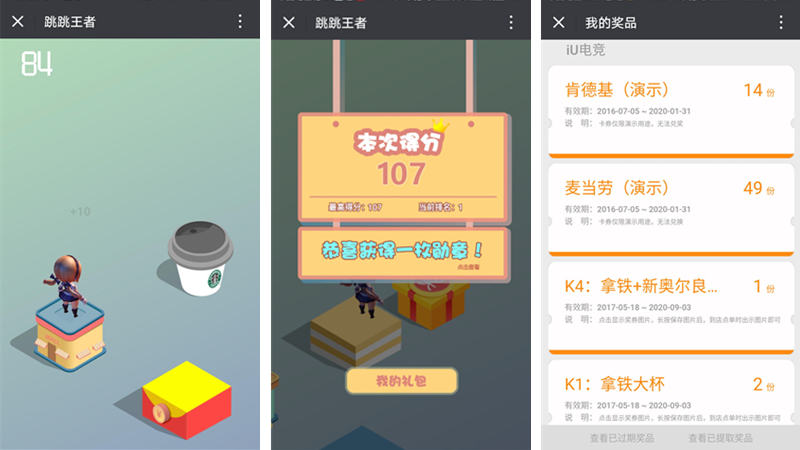 线上线下融合的跳一跳小游戏,可以做纯线上的活动,也可以线上做预热,线下做比赛。游戏中不时地出现代表红包和优惠券的小方块,玩家跳到中心点后可以获得红包或奖券。游戏结束后根据玩家获得的分数进行排名。